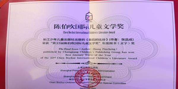 近日,第33屆陳伯吹國際兒童文學(xué)獎(jiǎng)?lì)C獎(jiǎng)儀式在上海寶山國際民間藝術(shù)博覽館隆重舉行,長江少兒出版社出版的長篇小說《最后的比分》(作者張品成)榮獲該獎(jiǎng)。