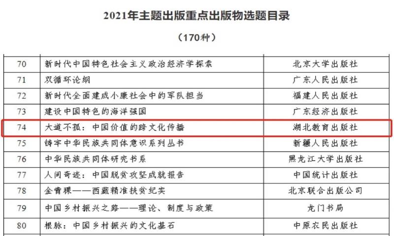 近日,中央宣傳部辦公廳公布2021年主題出版重點(diǎn)出版物選題,湖北教育出版社《大道不孤:中國(guó)價(jià)值的跨文化傳播》入選。