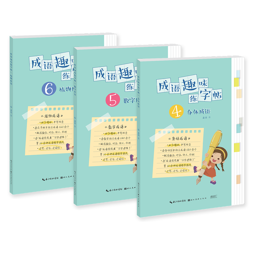 成語趣味練字帖第二輯3本套裝(數(shù)字、身體、植物)簡介本套叢書分為9冊,目標(biāo)讀者是中小學(xué)生或有寫字需求的人群。每本書的正文部分包含了成語的釋義、出處和造句,且有田字格以供描臨和對(duì)臨;游戲部分包含了十余種成語練字游戲,如成語接龍小迷宮、成語找找看、漢字迷路了、成語急轉(zhuǎn)彎、成語通八方等。書稿內(nèi)容豐富有趣,可以提升習(xí)字者的寫字興趣,也可以幫助其加強(qiáng)成語知識(shí)的積累?!渡眢w家族成語》由包含五官的成語、包含四肢的成語、包含頭腦的成語、包含發(fā)膚的成語、包含內(nèi)臟的成語以及成語游戲幾部分組成。出版單位:湖北美術(shù)出版社