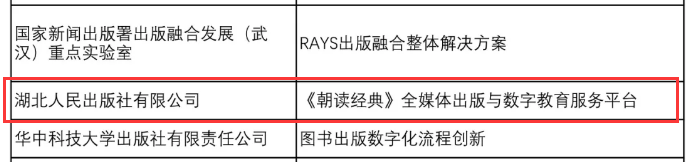 2021年10月,中國新聞出版廣電報(bào)/網(wǎng)公示了由中國新聞出版?zhèn)髅郊瘓F(tuán)組織開展的全國新聞出版深度融合發(fā)展創(chuàng)新案例征集活動(dòng)獲獎(jiǎng)名單。湖北人民出版社有限公司的“《朝讀經(jīng)典》全媒體出版與數(shù)字教育服務(wù)平臺(tái)”成功入選出版發(fā)行類創(chuàng)新案例。