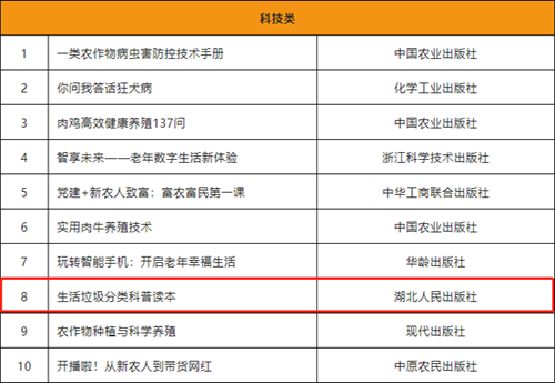 湖北人民出版社圖書《生活垃圾分類科普讀本》入選,這是該書繼入選“荊楚十佳圖書提名獎”“全國農(nóng)家書屋重點(diǎn)出版物推薦目錄”后獲得的又一殊榮。