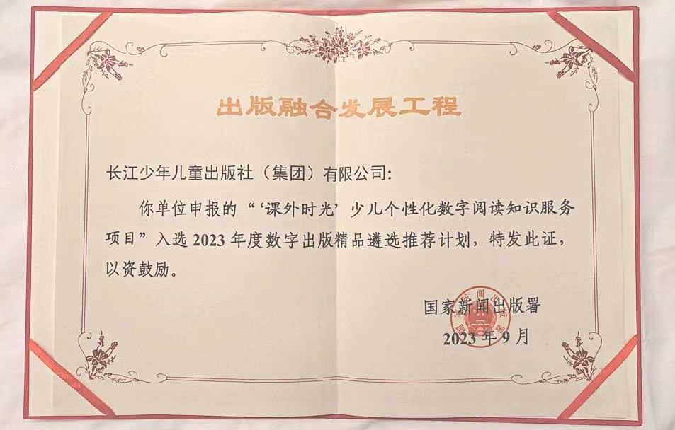 日前,國(guó)家新聞出版署公布了2023年度出版融合發(fā)展工程入選項(xiàng)目名單, 長(zhǎng)江少年兒童出版社(集團(tuán))有限公司“課外時(shí)光”少兒個(gè)性化數(shù)字閱讀知識(shí)服務(wù)項(xiàng)目入選數(shù)字出版精品遴選推薦計(jì)劃,同時(shí),長(zhǎng)少集團(tuán)還入選了“出版融合發(fā)展特色示范單位”。