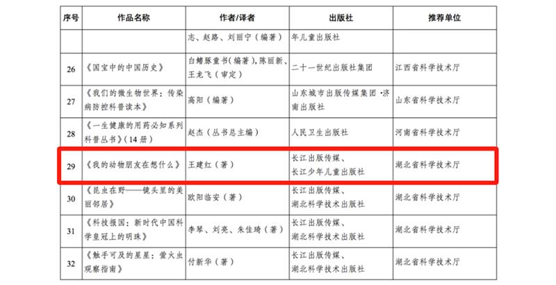 其中,長江少年兒童出版社共有4種好書入選2023年度全國優(yōu)秀科普作品名單,它們分別為:《“小病毒 大世界”健康科學(xué)繪本》(5冊)、《我的動物朋友在想什么》《進化史詩16講》《大象班都拉》。