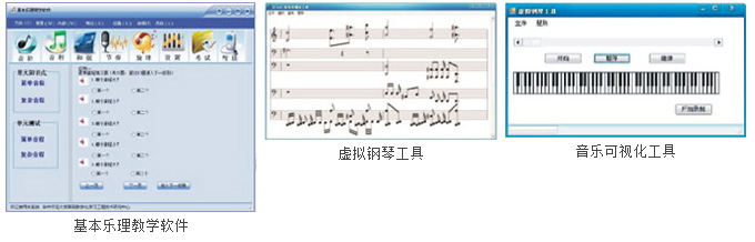 在國家科技支撐計劃課題《音樂數(shù)字化集成服務示范》的支持下,相繼開發(fā)了基本樂理教學軟件、虛擬鋼琴工具與音樂可視化工具。集成了教與學的諸多元素,實現(xiàn)了實時音樂教學、音樂彈奏與錄制、實時打譜等多項功能,極大地豐富傳統(tǒng)音樂教學手段。