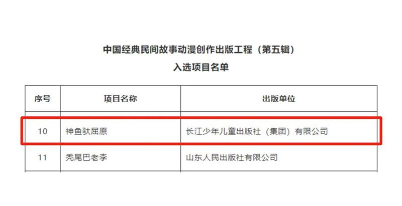 中國經(jīng)典民間故事動漫創(chuàng)作出版工程(第五輯)入選項目揭曉,長江少年兒童出版社出版的《神魚馱屈原》入選。