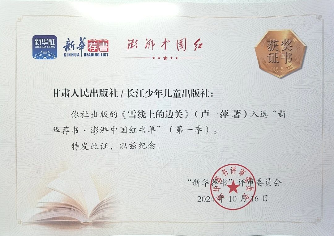 10月16日,“新華薦書?澎湃中國紅書單”(第一季)發(fā)布禮在浙江嘉興南湖發(fā)布廳舉行。經(jīng)過前期出版單位推薦、網(wǎng)絡(luò)投票和“新華薦書”評審委員會的評議,長江少年兒童出版社出版的《中國共產(chǎn)黨人精神譜系故事繪本·紅駒》和與甘肅人民出版社聯(lián)合出版的《雪線上的邊關(guān)》,兩種圖書入選該書單。