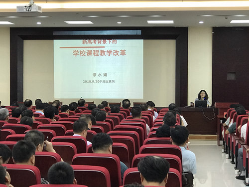 由教材中心聘請(qǐng)的浙江省副總督學(xué)、原教研室主任繆水娟女士做了《新高考背景下的學(xué)校課程改革》的主題報(bào)告。從學(xué)校課程的頂層設(shè)計(jì)、教學(xué)管理的創(chuàng)新重構(gòu)、課堂形態(tài)的深度變革、教學(xué)資源的有機(jī)整合、考試評(píng)價(jià)的跟進(jìn)改革等五個(gè)方面介紹了浙江省新課改的經(jīng)驗(yàn),為黃岡市新課改新高考提供了借鑒、指明了方向。參訓(xùn)人員認(rèn)真聆聽,不少局長校長主動(dòng)交流心得體會(huì),收獲頗豐。