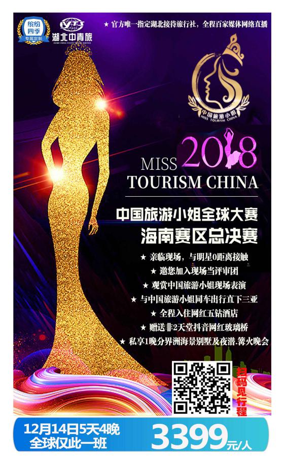 中國旅游小姐全球大賽是由中國國際文化傳播集團、香港衛(wèi)視國際傳媒集團聯(lián)合主辦的,具有獨立國產(chǎn)知識產(chǎn)權(quán)的品牌賽事。2018年中國旅游小姐全球大賽正在進行中,湖北中青旅以自身的品牌優(yōu)勢成為“2018中國旅游小姐全球大賽海南賽區(qū)”協(xié)辦單位。